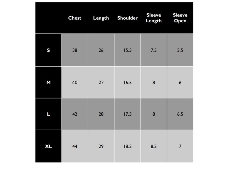 Find the perfect fit for your t-shirts with our detailed measurement guide.